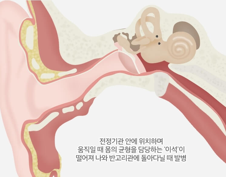 전정기관은 육체의 움직임을 확인하고 그 정보를 중추신경계로 퍼지면서 사람의 몸이 균형을 잡는 효과가 있어요. 전정기관은 수평과 수직운동을 확인해 이석기관으로 연결되 이곳에 많수많은 이석이 생기게 될 수 있다고 해요. 이석기관에는 직선 감각을 감지하고 감각세포가 분포하고 있어요. 이런 이석기관의 벽에 이석이 안착되어 있어 머리와 몸의 움직일 때 같이 이동해 감각세포를 자극하는 상황이 생깁니다. 이석의 일부가 원래 위치에서 분리되 회전 감각을 인지하는 반고리관으로 전해 들어갈 수가 있고 이 경우에문에서 이석증이 생긴게 돼요.