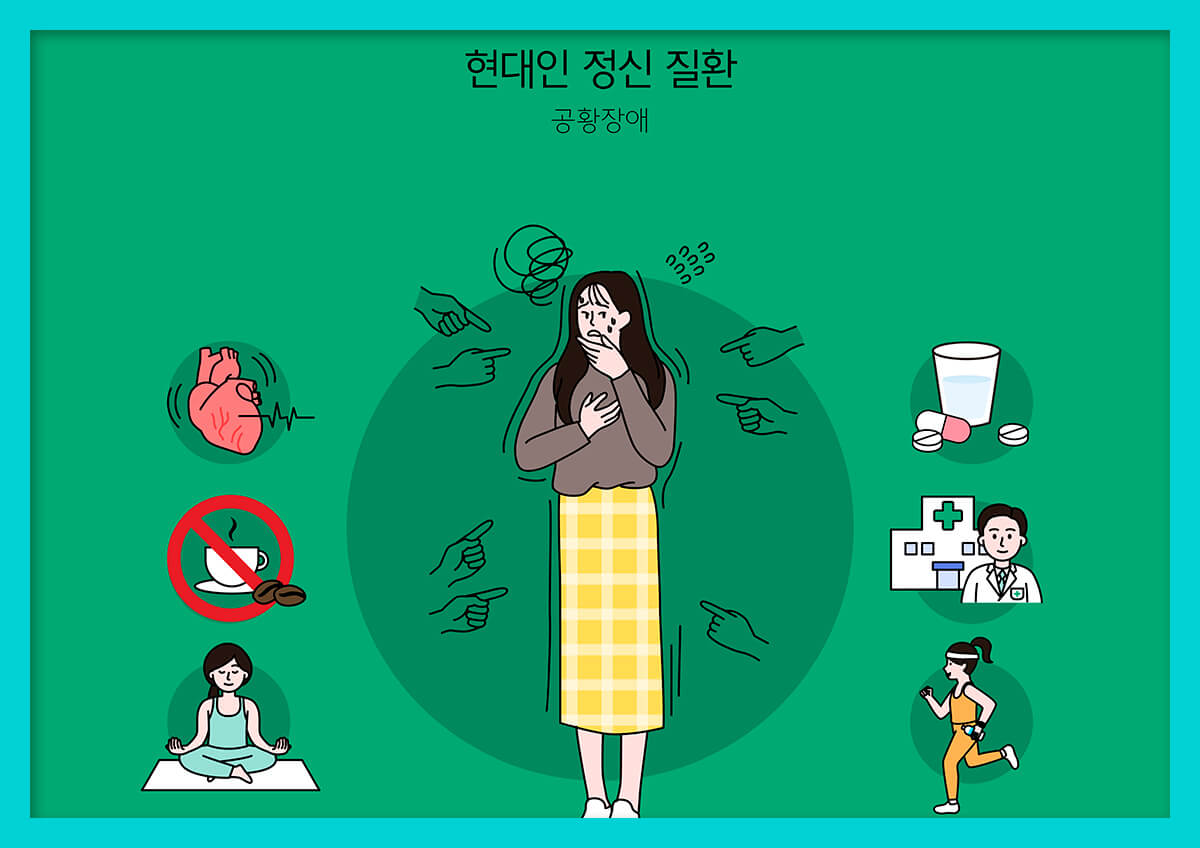 혹은 지나친 강박증으로 섭식장애를 유발할 수 있고, 수면장애는 물론이고, 부정맥으로 인한 심혈관계질환까지 불러올 수 있기 때문에 공황장애 증상을 겪고 있다면 치료를 시작하는게 좋아요.