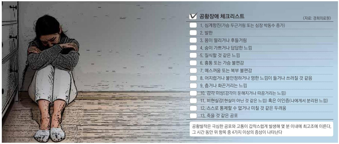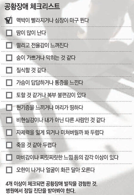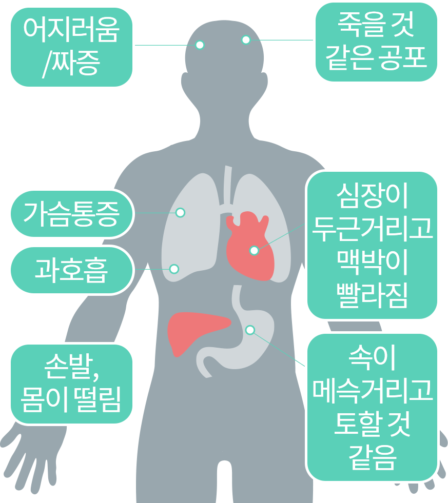 일상생활에서 숨이 막혀 호흡이 차오르고 가빠지는 느낌이 빈번히 든다면 공황장애 증상일 수 있어요.