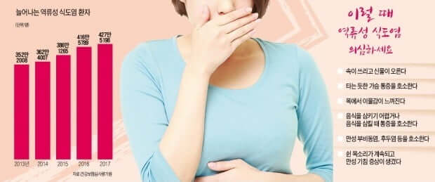 가장 흔한 증상으로써 식품을 삼킬 때 뭔가 긁히는 듯 한 느낌이 들 수 있다고 합니다. 이런 경우, 신 식품이나 매운 식품은 가장 큰 문제를 나타나게 할 수 있다고 합니다.