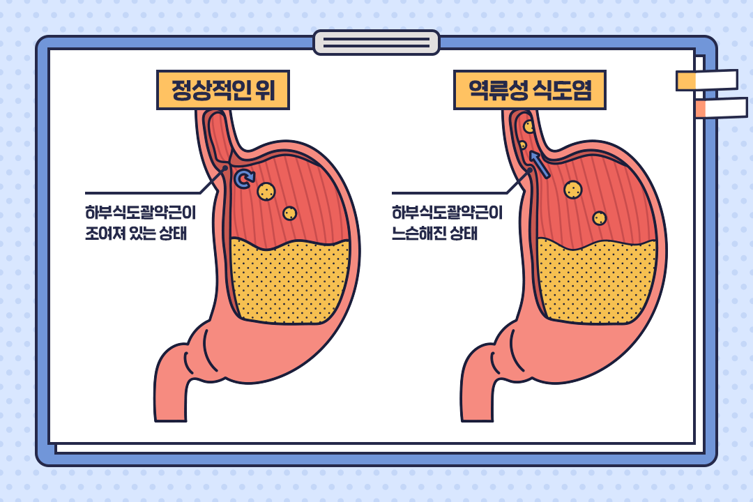 상이 경험하는 질환으로 위장병 중 가장 흔한 질환으로 알려져 있답니다. 정식 명칭은 '위식도역류질환'으로 위에만 있어야 하는 위의 내용물들이 식도를 통해 역류하여 문제를 유발하는 질환입니다. 오늘은 역류성 식도염의 증상, 원인, 치료 방법에 관하여 알아보시죠.