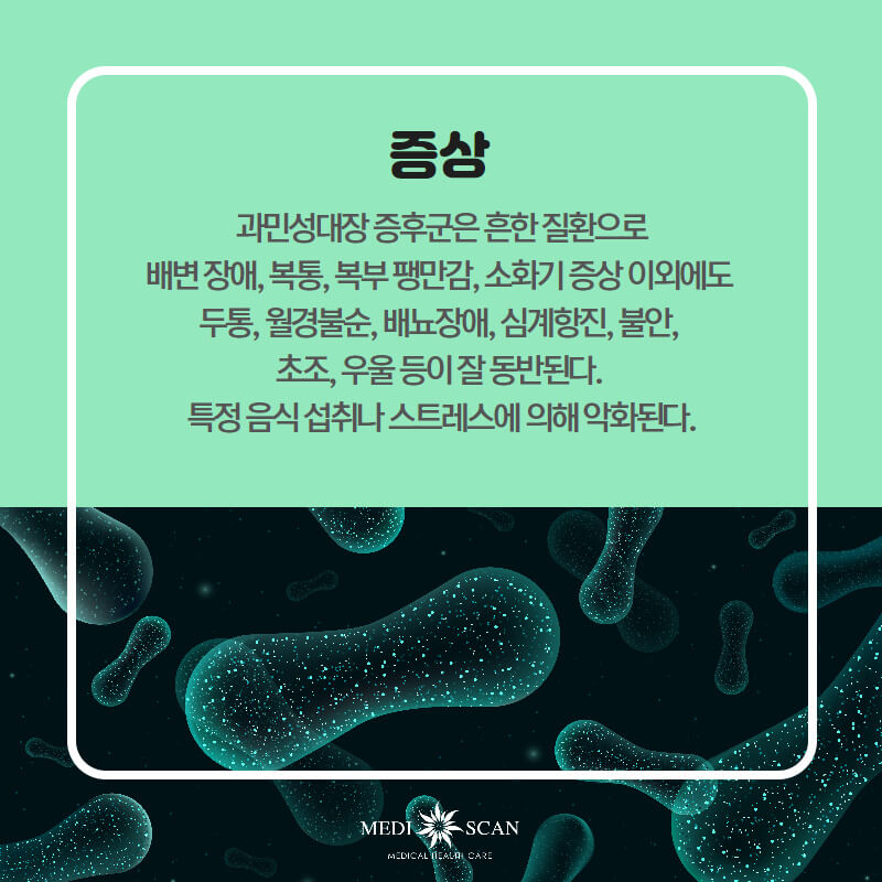 대장에 자극이 갈 수 있는 식품은 가려서 섭취하시는게 좋아요. 스트레스를 받지 않을수 있게 노력하는게 효능이 있습니다., 스트레스를 받게 되더라도 금방 스트레스를 해소할 수 있도록 해야 해요. 정신건강 상담과 스트레스 감소는 어떤 사람에서는 과민성 대장 증후군의 증상을 호전시켜주며 또한 식사에 섬유질 양을 늘려주는게 증상을 완화하는 데 도움이 돼요.