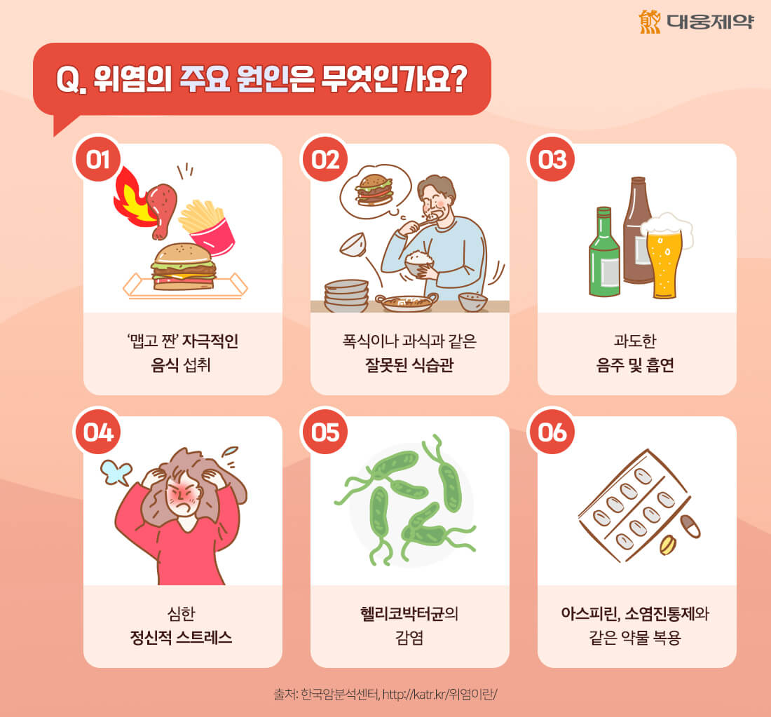 술과 담배도 큰 원인이 될 수 있어요. 음주를 하게 되면 알코올이 위를 자극해 위염이 생기게 되며 담배에 든 니코틴 역시 위산 분비를 자극시켜요. 보통과 다르게 공복에서 담배를 피면 위산이 분비되어 위벽이 상할 수 있다고 하며, 금주와 금연도 위를 지키는데 도움이 된답니다.
