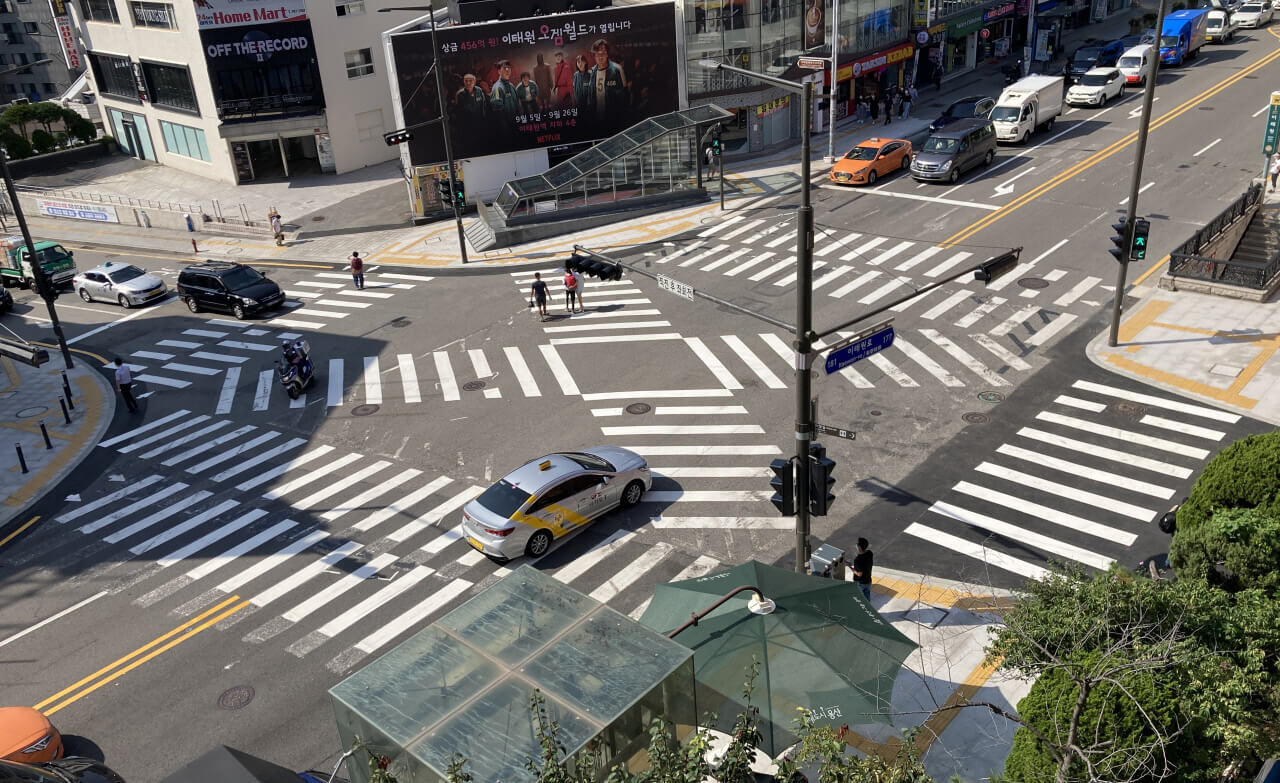 이번엔 반대로 우회전을 하려는데 보행자나 신호를 기다리는 사람이 없다면 서서히 서행하며 횡단보도를 지나가면 된답니다.