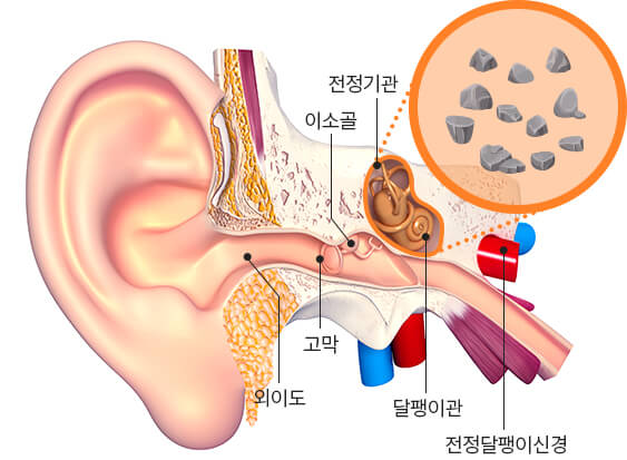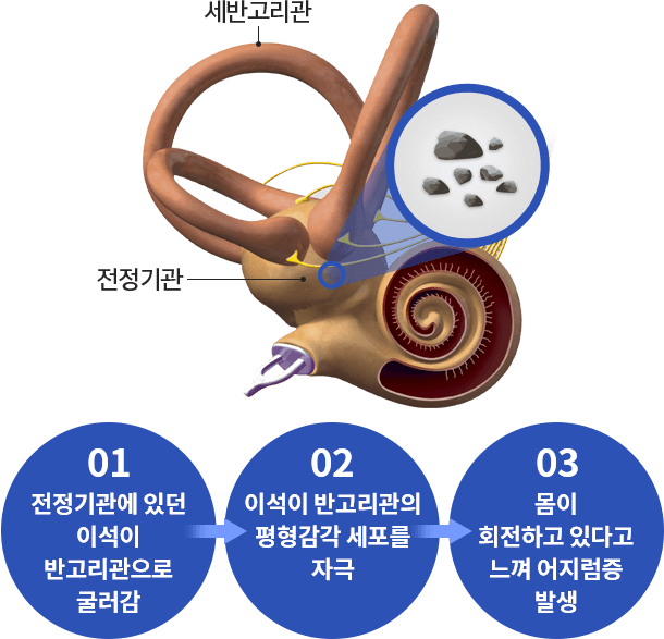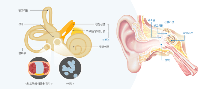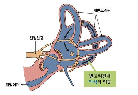 전정기관은 육체의 움직임을 확인하고 그 정보를 중추신경계로 퍼지면서 사람의 몸이 균형을 잡는 효과가 있어요. 전정기관은 수평과 수직운동을 확인해 이석기관으로 연결되 이곳에 많수많은 이석이 생기게 될 수 있다고 해요. 이석기관에는 직선 감각을 감지하고 감각세포가 분포하고 있어요. 이런 이석기관의 벽에 이석이 안착되어 있어 머리와 몸의 움직일 때 같이 이동해 감각세포를 자극하는 상황이 생깁니다. 이석의 일부가 원래 위치에서 분리되 회전 감각을 인지하는 반고리관으로 전해 들어갈 수가 있고 이 경우에문에서 이석증이 생긴게 돼요.